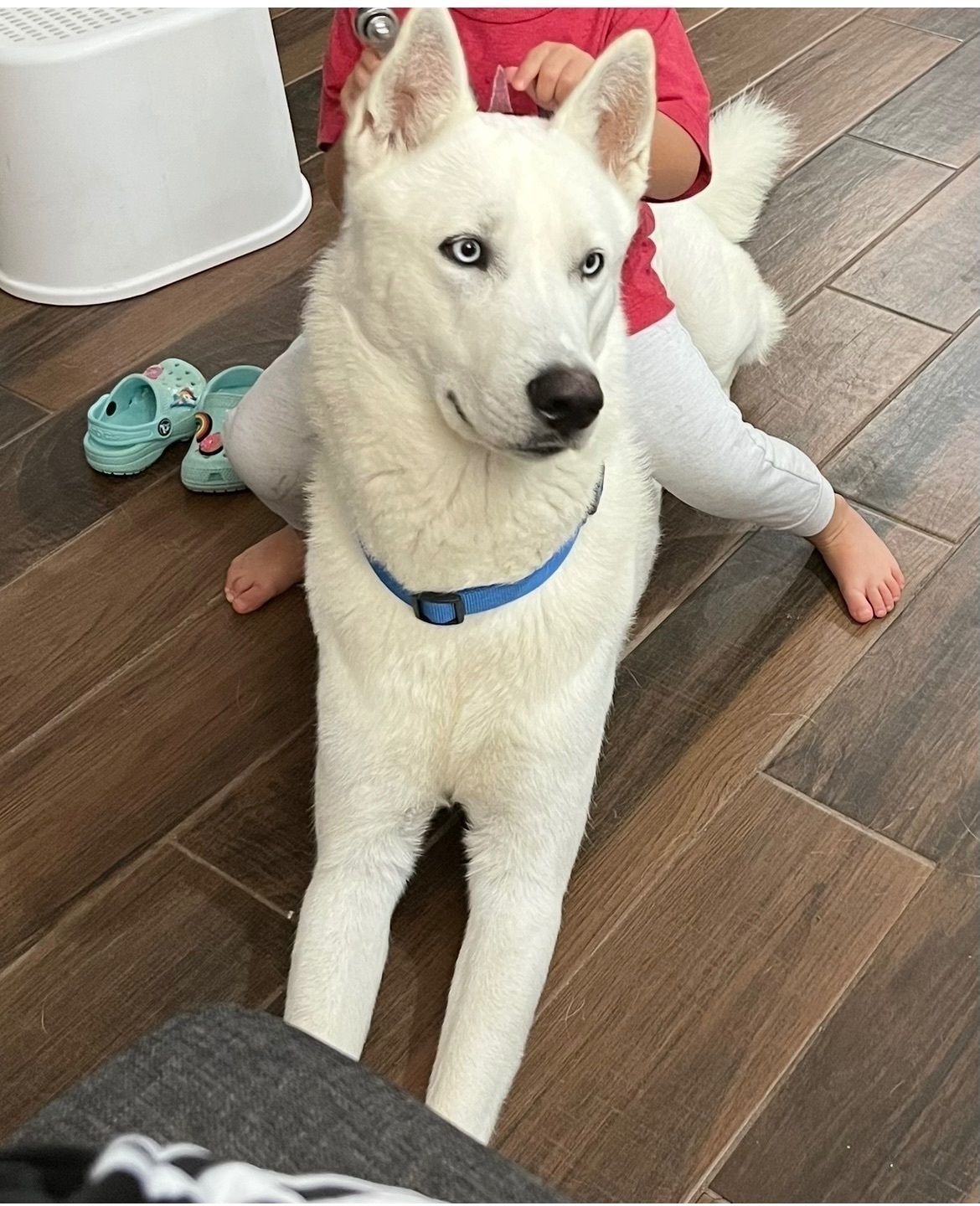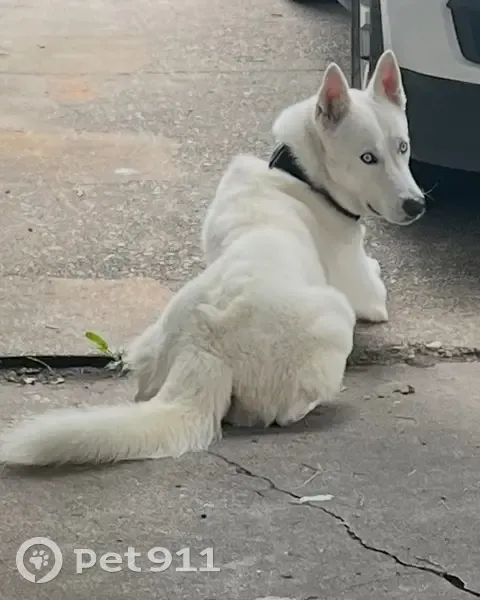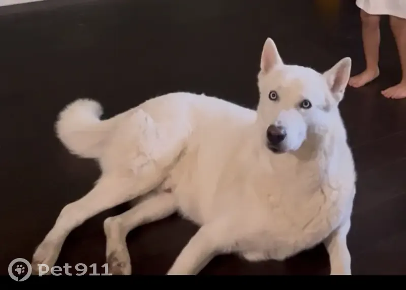 4 year old (adult dog) male husky. His name is Koda, he is all white with bright blue eyes. Was not wearing a collar the night he went missing but he is chipped.