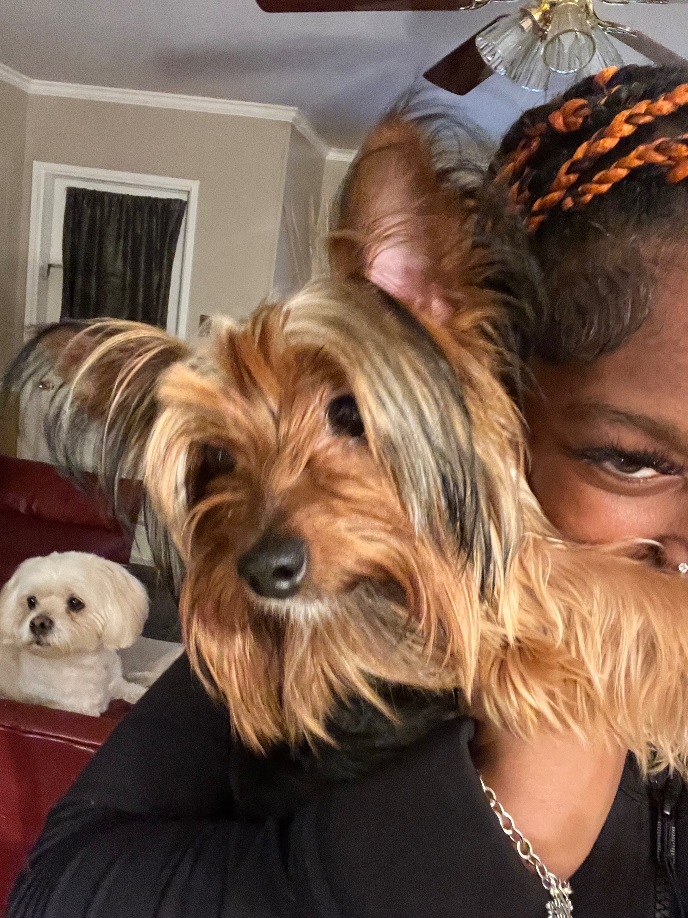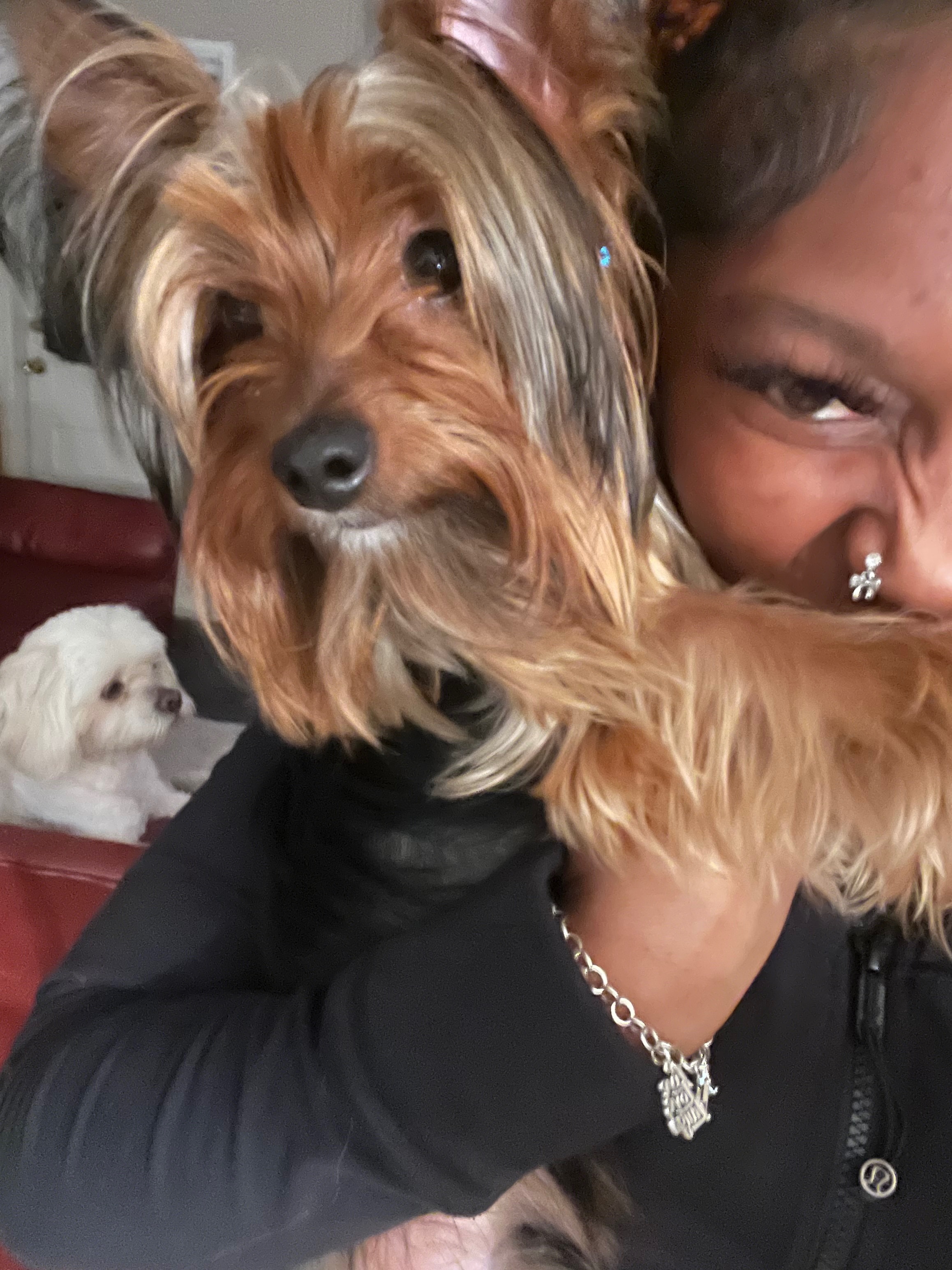 Yorkshire Terrier with a silky coat. His fur is a warm mix of golden brown and gray, with longer hair around his face that frames his dark, gentle eyes and little black nose. His ears stand up alertly, giving him a curious, sweet expression, and he looks calm and trusting while being held. My family was having a get-together, and with so many people going in and out of the house, things got hectic. At some point during all the activity, he slipped away and got lost. Everyone started searching, calling his name, checking around the neighborhood, and we were looking for him for hours, worried and hoping he was safe the whole time.