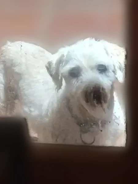White terrier mix senior recently groomed wearing blue collar. He has slightly visible beige spots on back and tops of ears. He also has small moles between toes. Friendly pls contact either phone # on listing