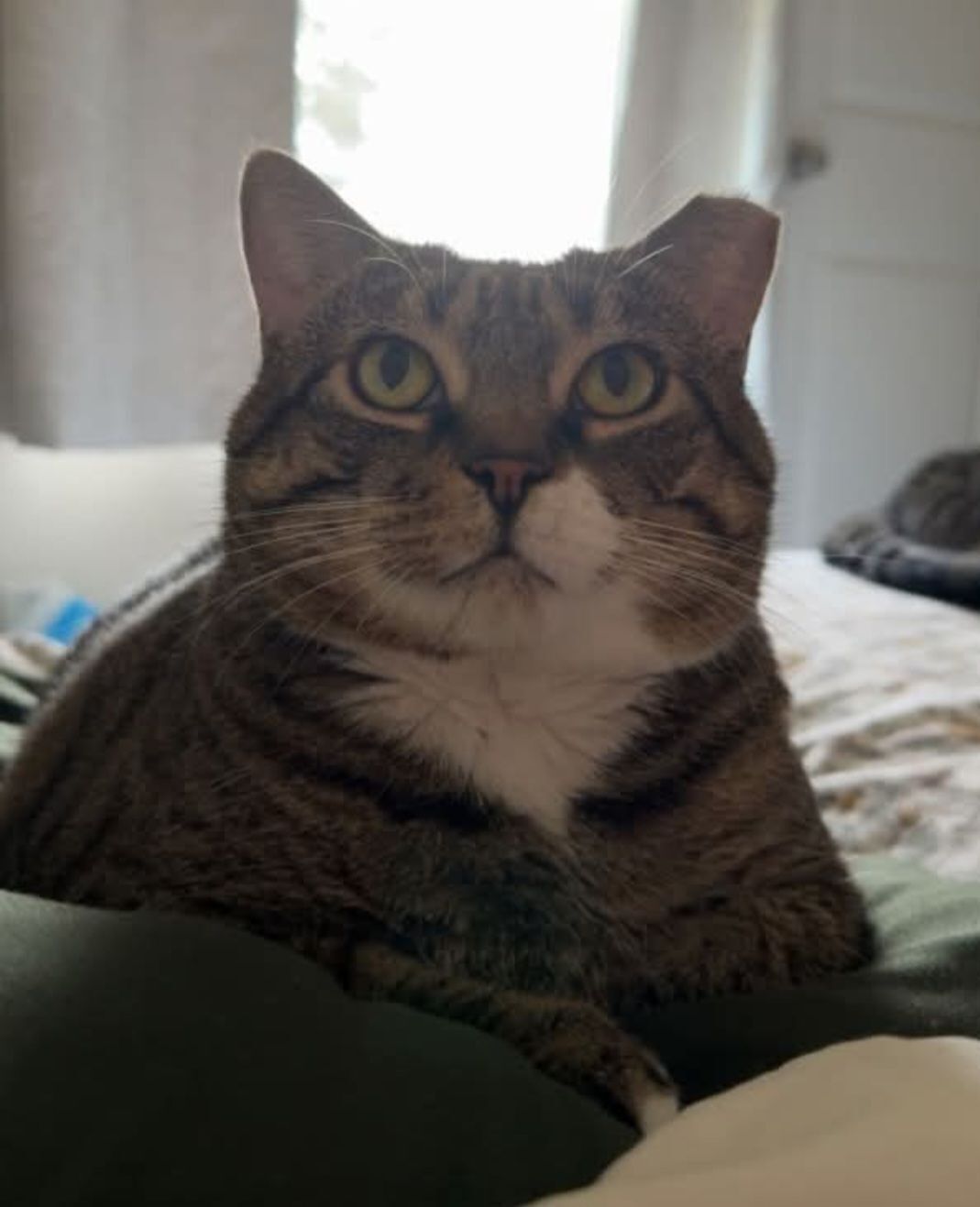 Momma Starr is an adult, tabby cat, approximately 4-5 years old, is spayed, but not micro-chipped. Starr has a clipped, left ear, from when she had been an outside cat, prior to my finding her and adopting her (she was outside in the winter and needed a home). Other markings include white tipped, front paws, white back legs, white colored chin/neck, and is gray/black/white/very little brown (facial, near nose mostly).. Consistent tabby-cat markings. Starr is a loving, sweet cat, that would warm up to people after a short period of time, and I believe she would have tried to go into someone’s home/garage, etc. As she would be trusting and approachable.