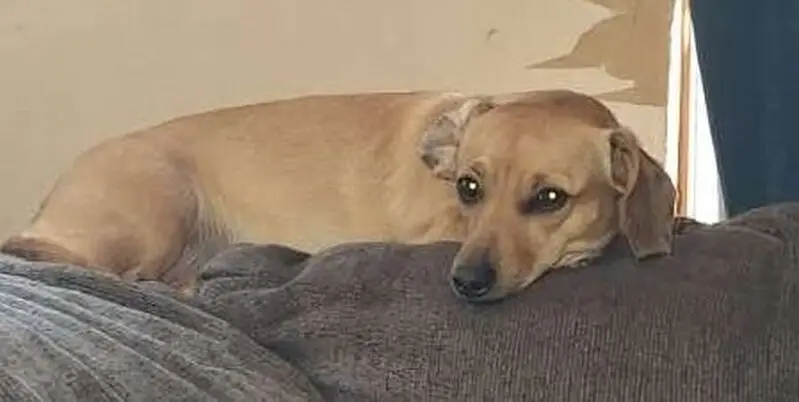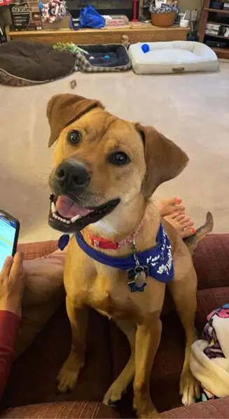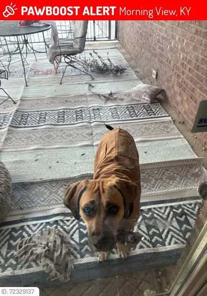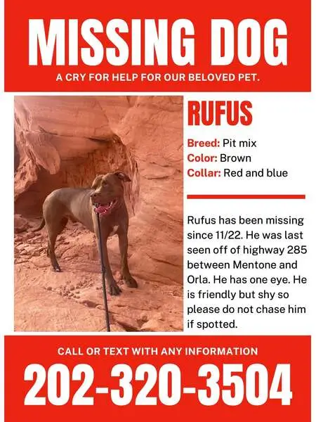 Brown with white underside. Super sweet but scared. Has red marker or sharpie on his face and body. Scar beside ears. Puppy no more than 6 months old