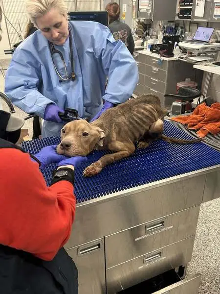 Short hair put mix. Tan and white. Neutered. This is a young dog probably 9-12 months. Playful and knows the command 'sit'.
