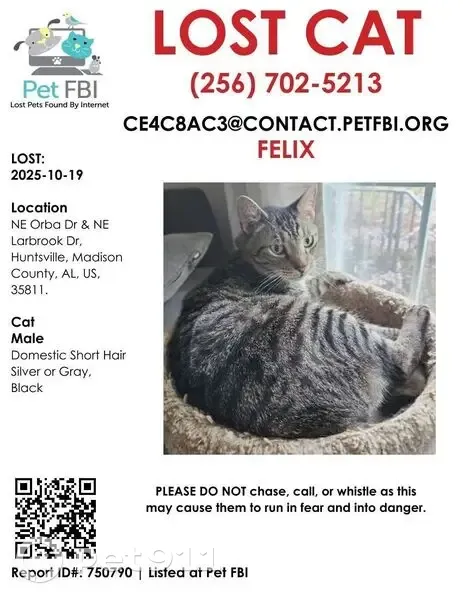 Gray/black tabby, long black stripe on his column, salmon nose, bald spots in paws and belly, amber/yellow eyes. Felix was wearing a patterned orange and green cloth collar and a purple heart shaped tag. He has a microchip as well but no snipped ear. He is sweet but nervous so he may not get too close unless invited for snacks.