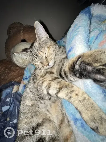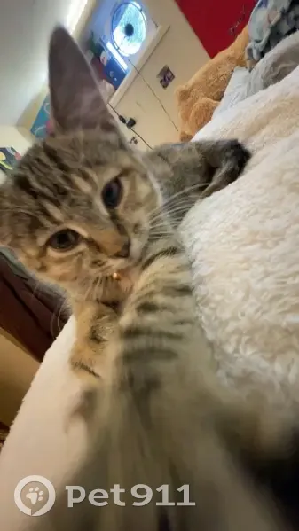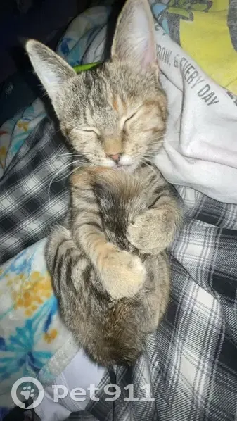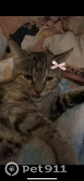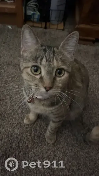 She’s laugh brown with stripes and has an orange tip on her tail. She’s wearing a dirty pink collar with pineapples and a bell on it, she’s 1.5 years old but still very small. She’s skittish and will come running if you call her name and shake treats. She’s been sick and has been having coughing fits.