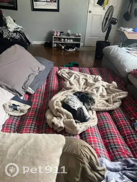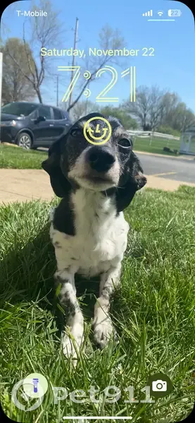 Chuck is a black and white dachshund and has no collar. He is small and spotted. He escaped our yard and was last spotted off Chrysler and Elm near the bridge over the train tracks