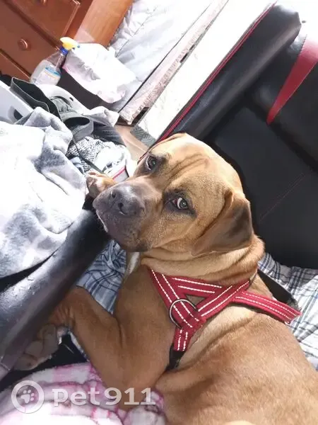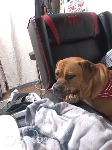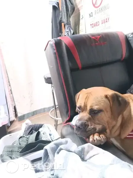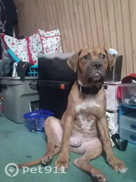 He's brown, his chest has some white on it floppy ears hes a mastiff and boxer mix not yet 1, he might come off as mean because he barks or growls if he doesn't know you in the past he was abused before I had gotten him. His name is chopper hes sweet just gotta be very easy n gental with him. He is my baby