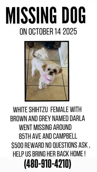 Found him on the corner of Stop 11 and Inverness Dr. He is a white and brown Shih Tzu. With a purple collar. He has. It tags and he has not been chipped.