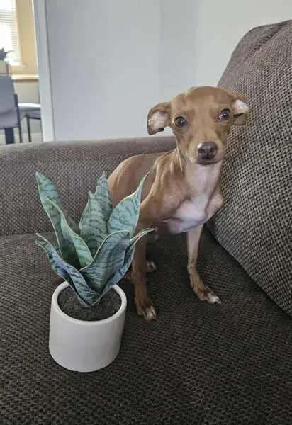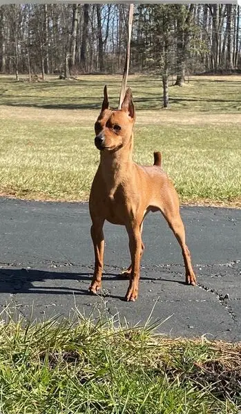 Female chocolate mini pinscher found by a Good Samaritan near South Girls School Rd, near Amazon Fulfillment Center. Wearing two collars, one is an E-collar.