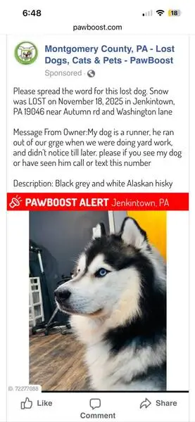 Male, neutered, well groomed, husky that was skittish but very friendly and good with other dogs found at Christian Park.