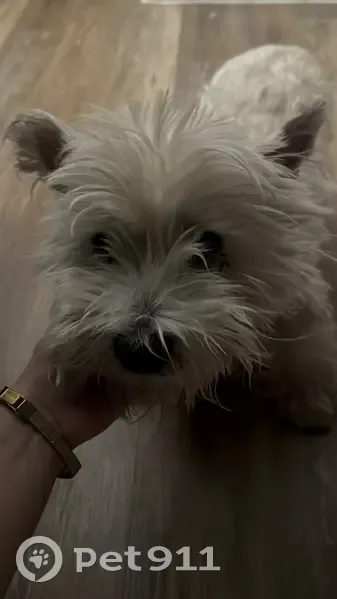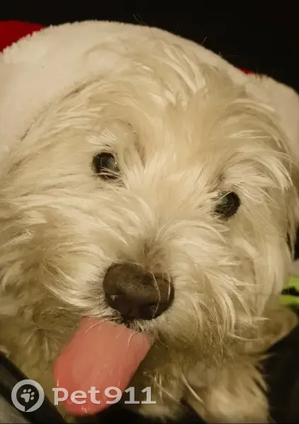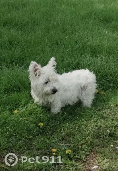 He is a westie poo, white, has dark spots on his belly and arms, he is small, weights around 25 lbs. He is shy and can be agressive towards unknown people especially when scared. He doesnt have a microchip.