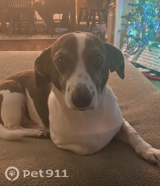 Black white and brown 30 pound dog named Bentley. Went missing Friday Feb 6th at 2pm. Neighbors came to let her out while the family was at the hospital. She got scared and ran. She is timid but sweet natured. Responds better with treats.