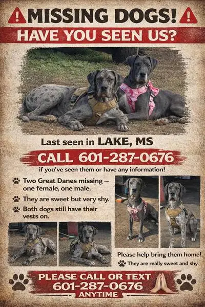 Update: The dogs ran off last night. We do not have them anymore. These dogs have been around Pearl Lane in Irving all day. They are healthy and very friendly. We have them in our back yard. Major intersections are Shady Grove and MacArthur. We live on Lake Vilbig.