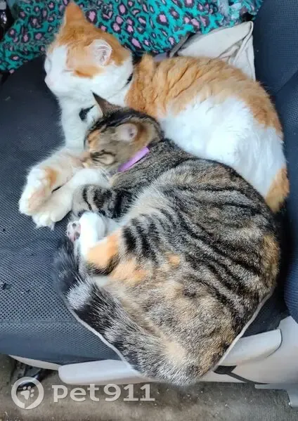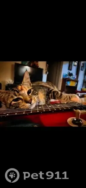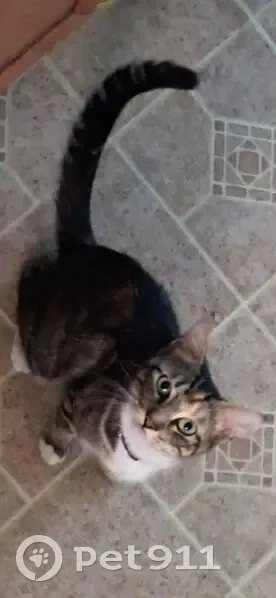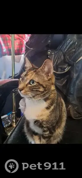 She's a short haired black and brown striped tabby with a white chest and paws and patches of orange, and is wearing a tennis ball green collar (though it's a breakaway so there's a chance shes lost it). She's very loving but is extremely stand-offish to strangers so I doubt anyone will be able to get her to approach them, she loves to hunt though so she might be spotted lurking in bushes or a tree.