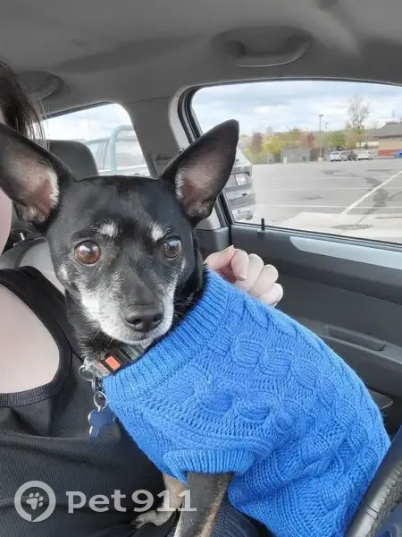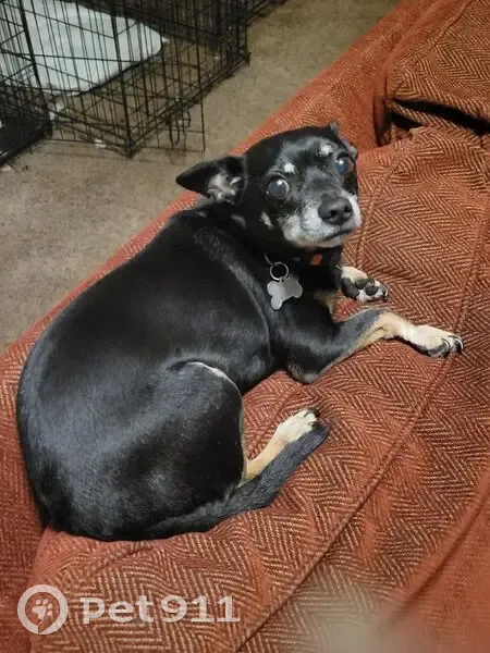Black chihuahua with white muzzle and eyebrows, 9 years old, blue collar with his name and my info on it. Very shy and often has his ears back submissively. Usually very quiet, but if he barks it's very raspy.