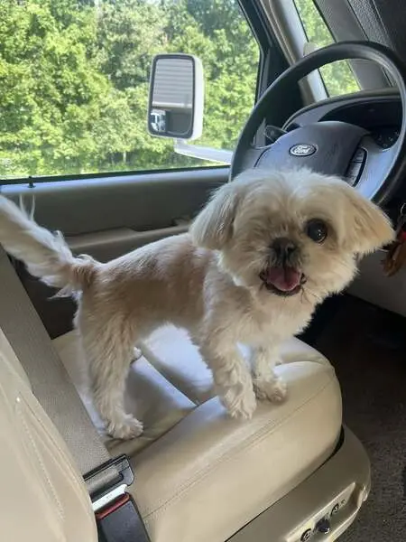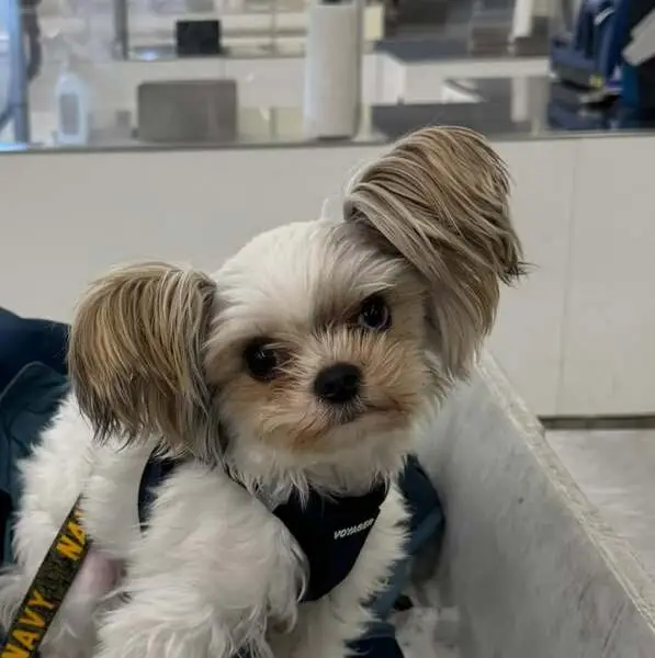 Small white dog, blue collar, blue jewel on forehead, seems recently groomed. Ran up to us during fireworks. Very sweet, definitely well taken care of