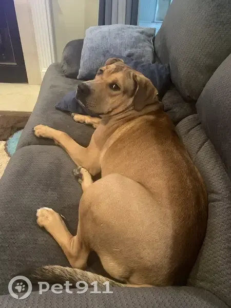 80 pounds tan coat white chest scarring between his eyes on the lower right side and three white nails on the front left paw answers to Buddy, big lap dog