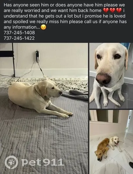 Canelo is a yellow lab he has on a chain collar and a green one and he is also chubby.. He left out backyard on Monday night and he has been missing since then. We are giving a $500 reward whoever finds him and brings him to us.. 737-245-1422 737-245-1408