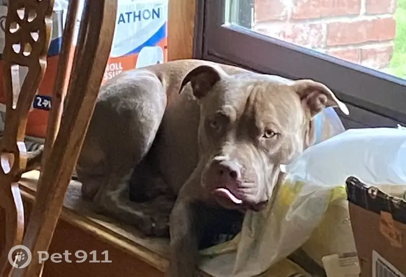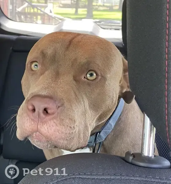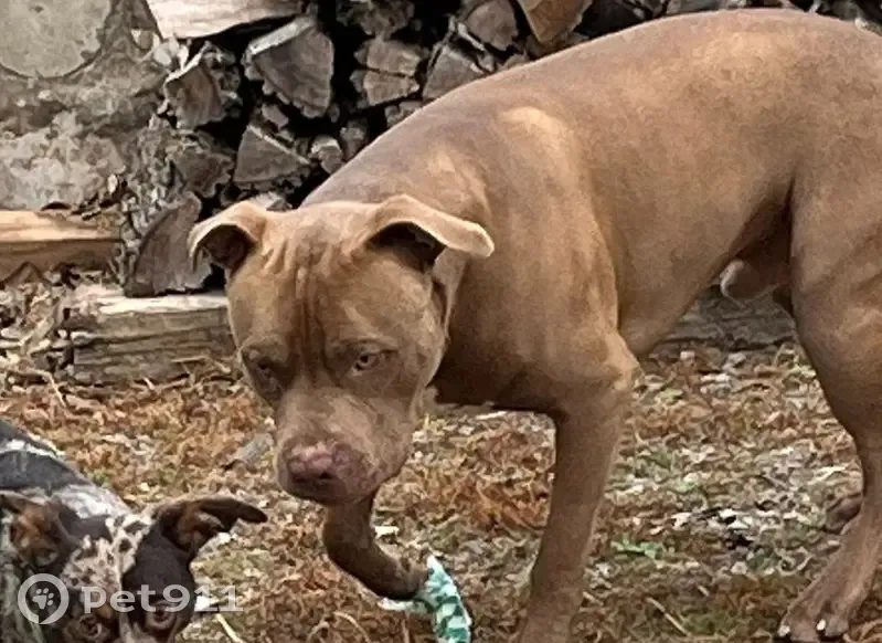 Hank is a light brown Pitbull, yellow eyes, 1.75ft tall, white patch on chest, full tail and ears, pink nose, 2 years old. Extra detail: he has a white toenail on his front foot, missing his right canine tooth, unneutered.