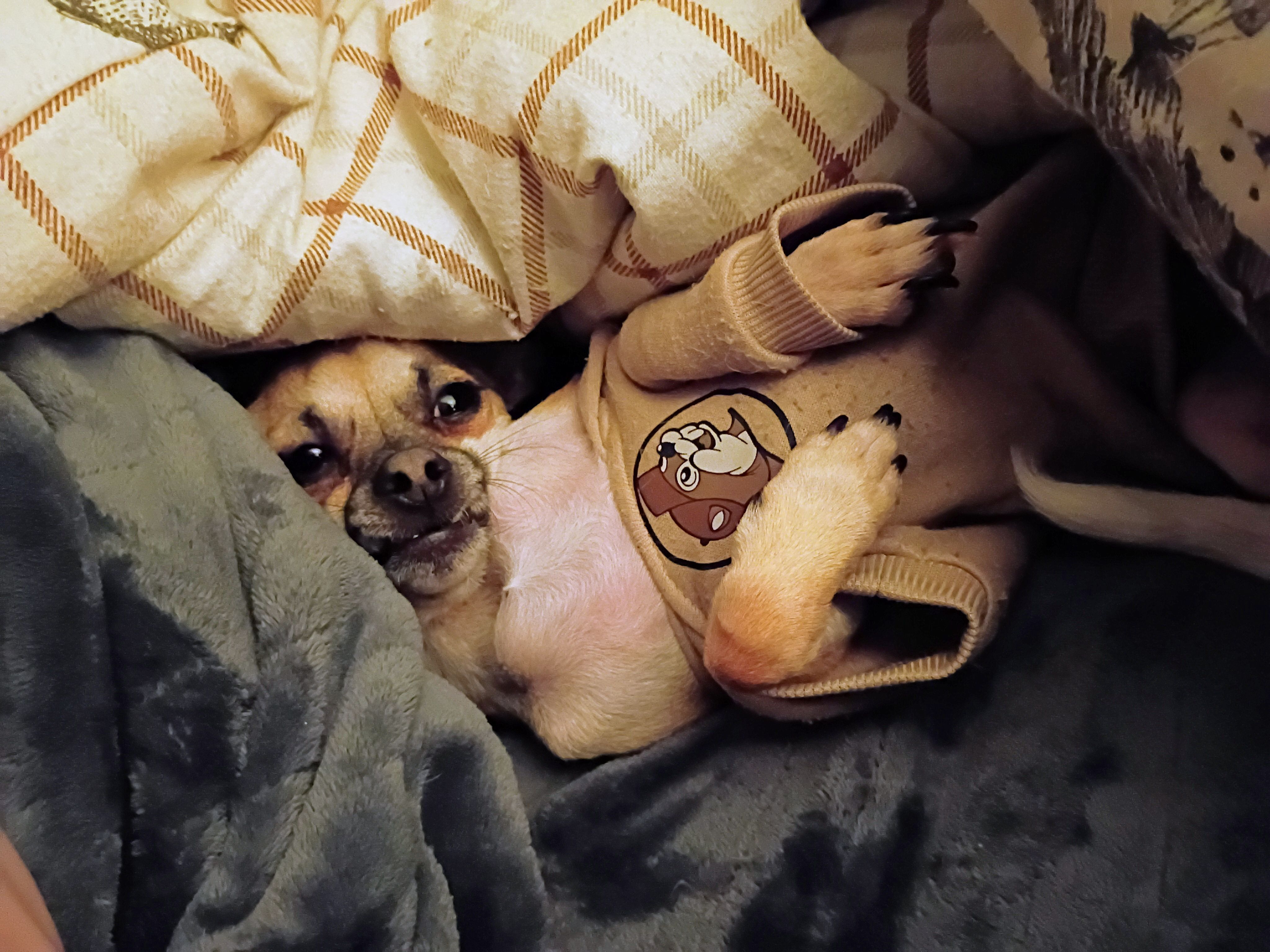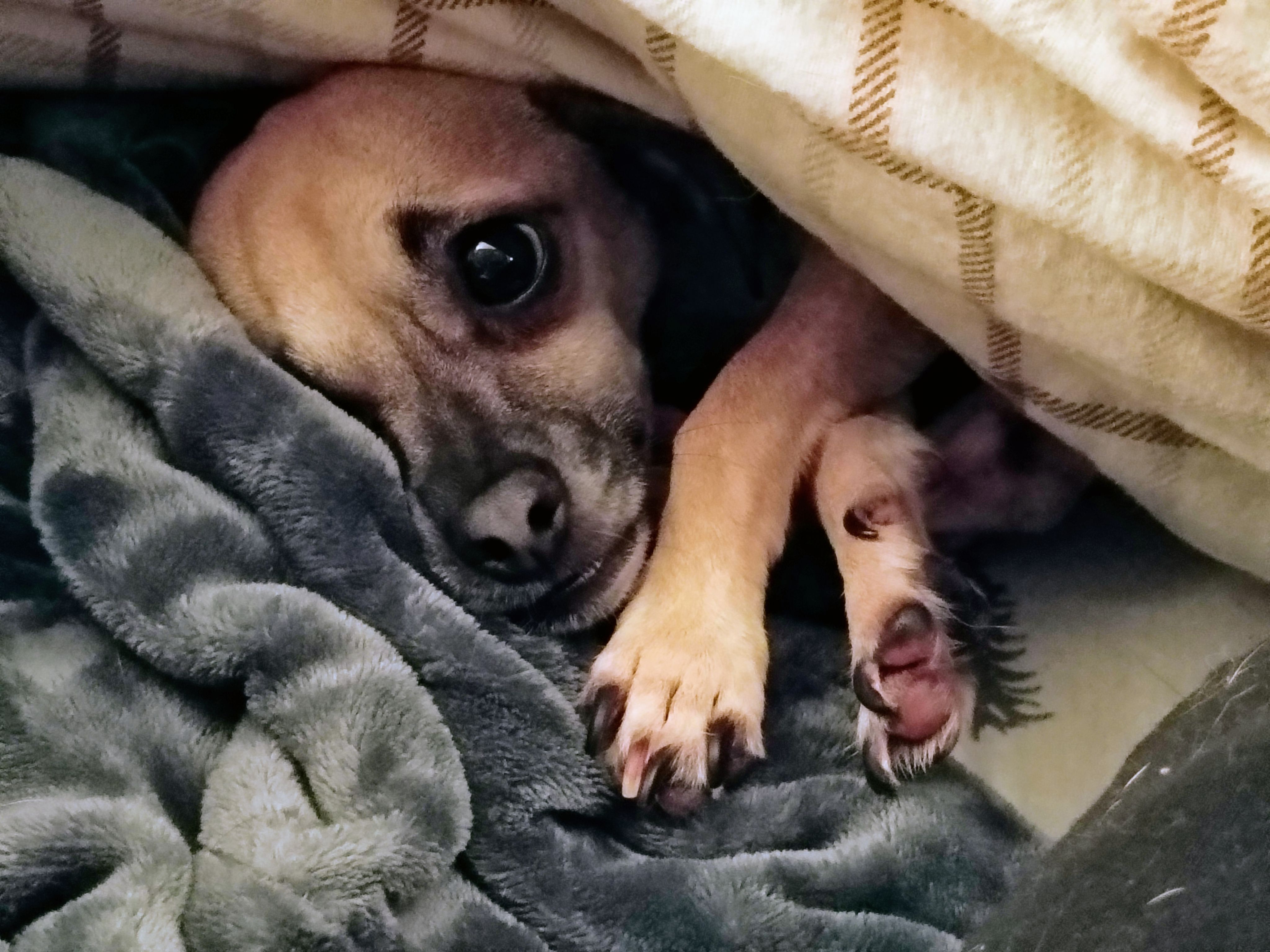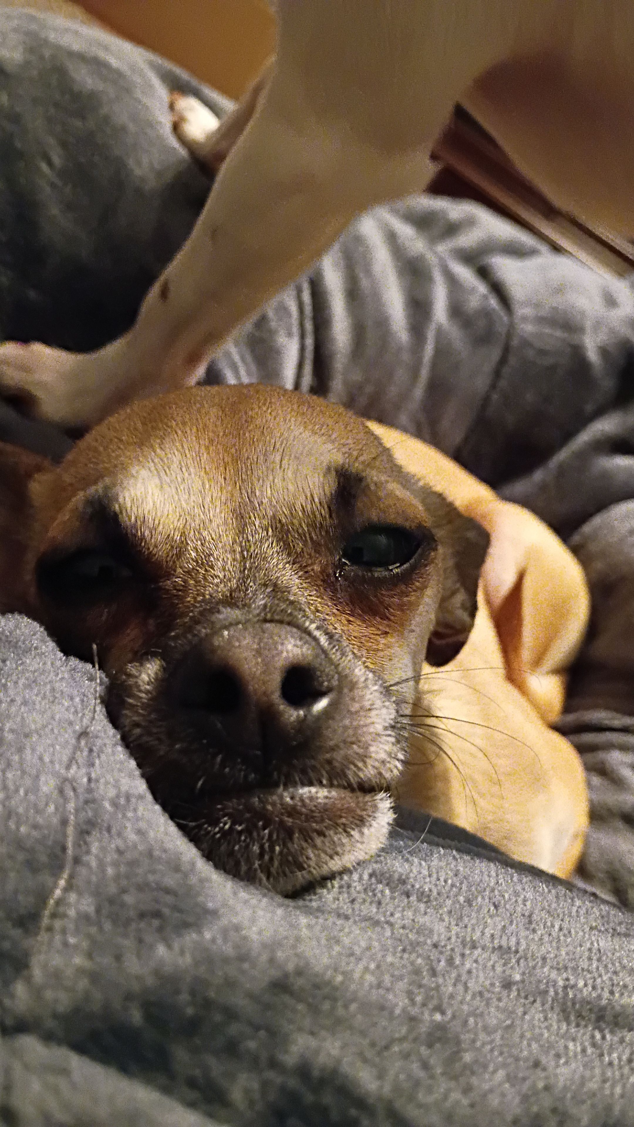 Luna is a small brown chiweenie about 8 lbs. Has brown eyebrows that make her always look sad. She looks thin, but she is a very healthy weight according to our vet. She has an under bite and is a super sweet girl. She is skiddish around strangers and will run away or hunker down to hide.