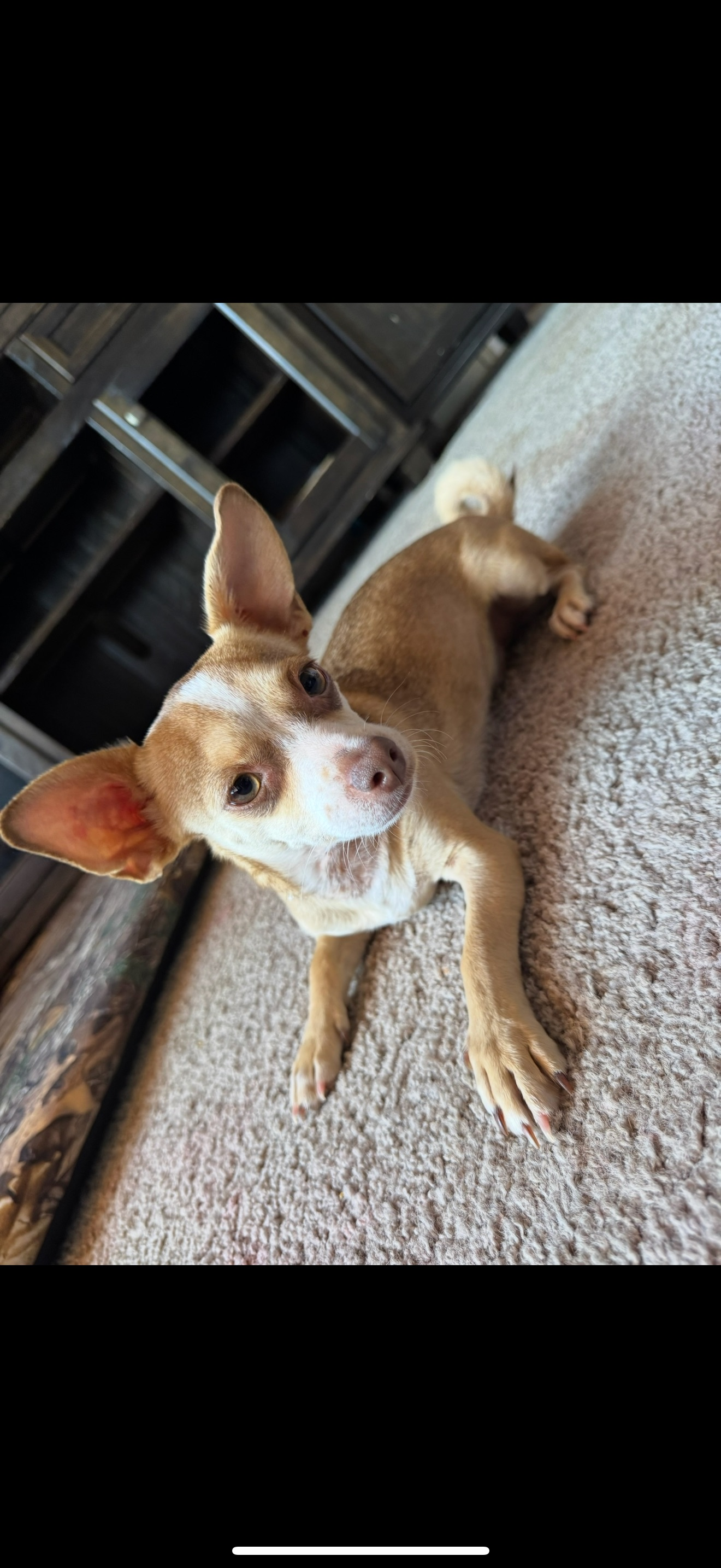 Light brown with light brown around the eye white marking on forehead and a white chest area. His name is Yoda. He is kind of scared he will run from you.