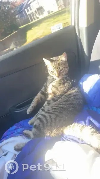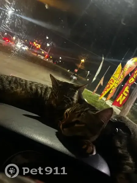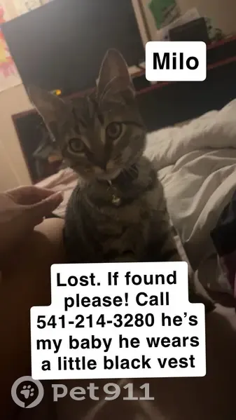 He’s a domestic shorthair, tabby? Has black and white lines to his nose, black tail tip, and he’s the size of a small dog. S black thick line on his back