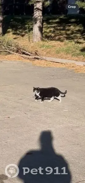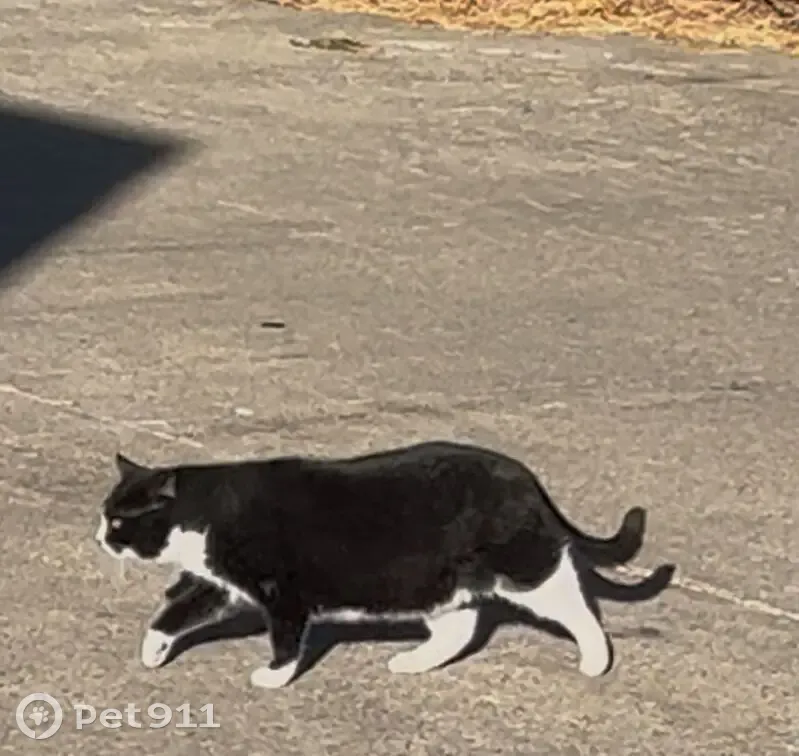 Black and white, mostly black with a black "smudge" over the nose. White goes high up on the back two legs. Found him sitting on a platform behind Walmart.