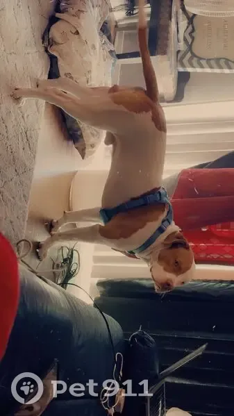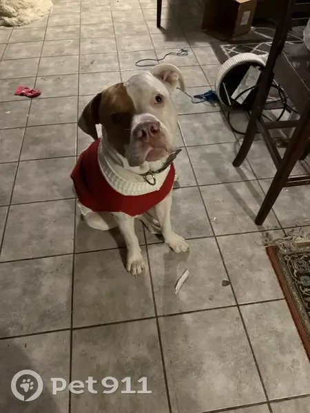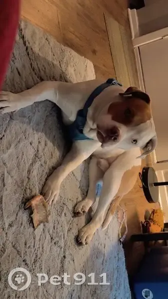 Was stolen by my brother and sold to someone possibly in palo pinto County. Not for sure. He's white with distinctable tan spots. And brown right eye/head left white. On left side has tiny brown mark on ear. He is very vocal and loves butt scratches. Acts like hes starving all the time. 13 months old and 115 lbs. Leather collar om with teal. Nickname is fat daddy