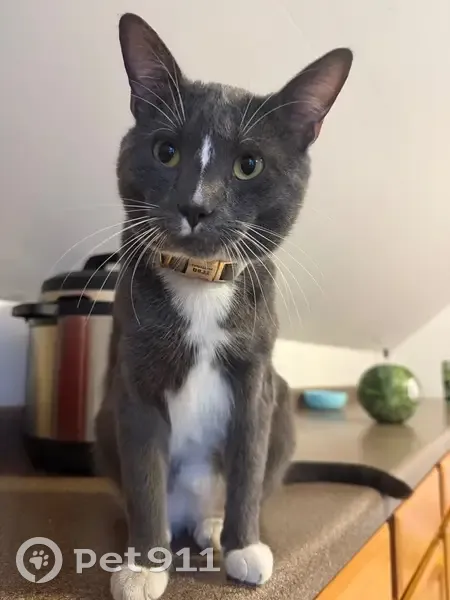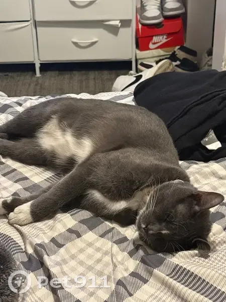 He is a grey cat with white paws, he has a collar with “Eren” and a phone number on it, he is kind and may be scared, I have been looking for him the past 4 days.
