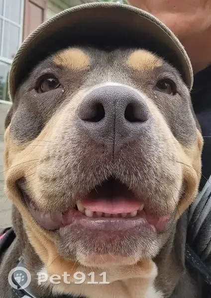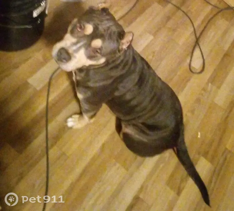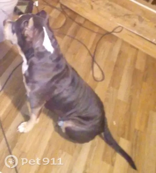 American Bully Tricolor dark brown, tan and white with a white feather on the back of her neck. Sapphire and our new puppy Bolt were taken out to potty then back to bed around 5am. When we woke up before 8am noticed they weren't in bed, cage, or yard. We walked around our neighborhood looking, whistling, yelling for them and even took our older dog around neighborhood. Pup was found alone, a few blocks away from where they went missing and brought back home 2 days after disappeared. Sapphire is very energetic and friendly, loves all kids. She loves to chase anything that'll run, especially deer.