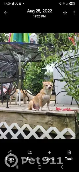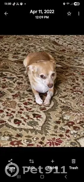 Light tan and white chihuahua mix. Neutered male. 19 years old. Large fatty tumor on neck / chest area. Going blind and hard of hearing. Very sweet. Probably very scared. Hes never in his 19 years spent one night alone. Please do not chase. He went missing around 3 pm on Monday. Located in a very large trailer/ junk yard area surrounded by thick undergrowth and dense woods. Thousands of hiding places. Overwhelming search conditions. Please help! Loverboy is a very loved family member. I personally dont know life without him. Please help me find my baby!