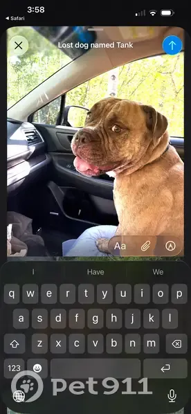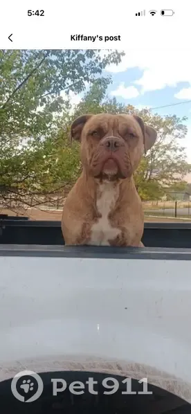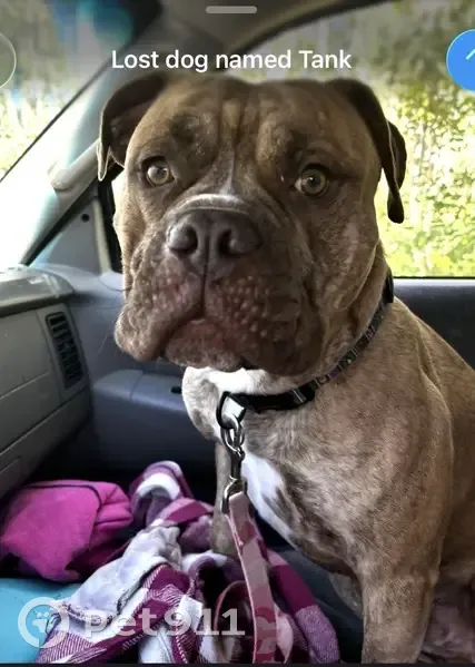 He is intact, two years old, brindle in color with a white spot on his nose and chest. He was wearing a black collar and he is micro chipped. He is a really good boy but not very socialized. He’s fanatic about his tennis ball and he loves water and mud
