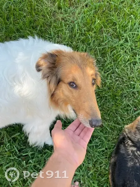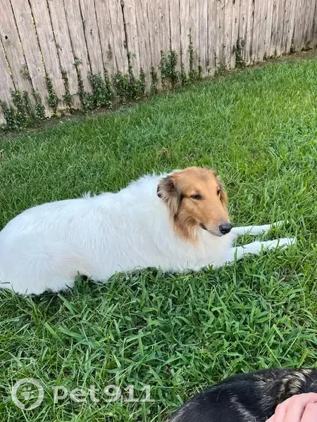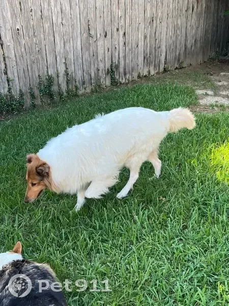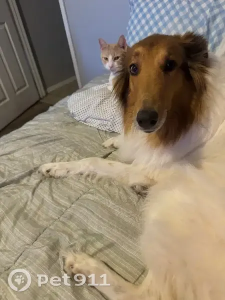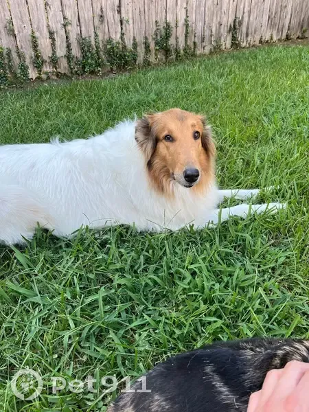 All white body. All brown head. Kinda skiddish. Her full name is Ophelia and she responds to Ophie. She’s really sweet but gets nervous easily. She is a big part of our family and my three and two year old daughters are so worried about her with the rain coming up.