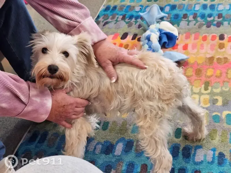 "Moon" is a Miniature Schnauzer... 6 and 1/2 year old spayed Female... White fur... White beard with some salt & pepper... Pink collar with some yellow striping. Brought Moon home from adopting her at Rescue shelter. When we got out of the car, she managed to pull her legs out of her harness, slipped out of it and started to run. She is very fast - we were unable to keep up with her.