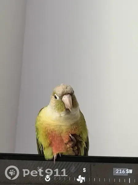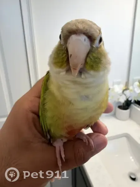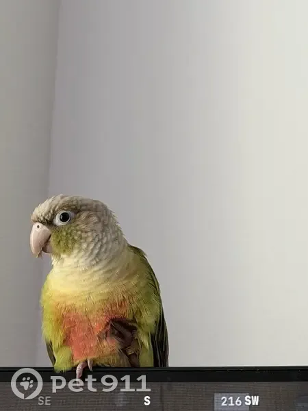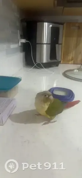 He is a smaller bird with Primarily Green feathers with some longer red feathers on the tail and a bit beige/peach on head along with green. He responds to peach name and is 1 year old.
