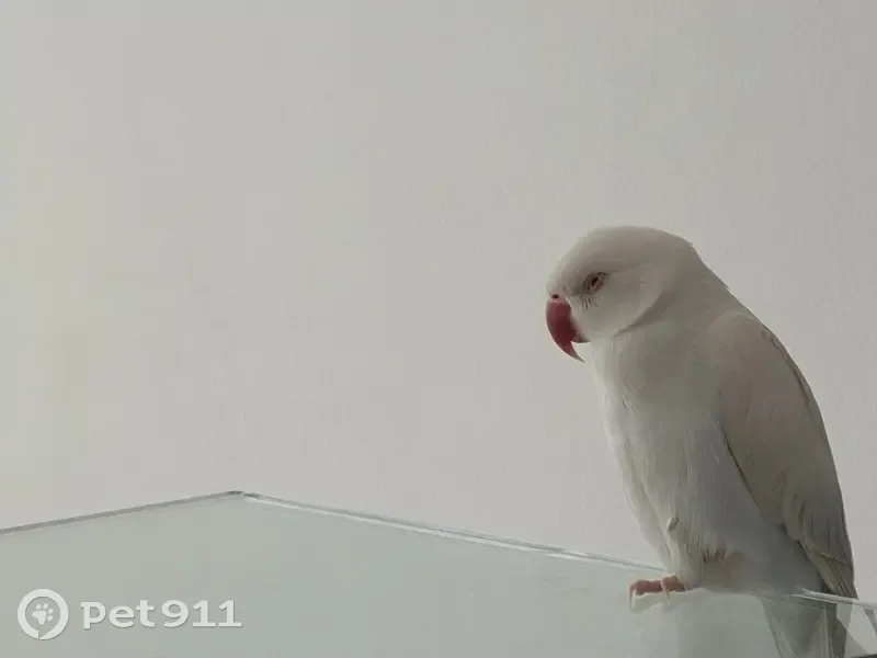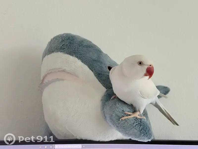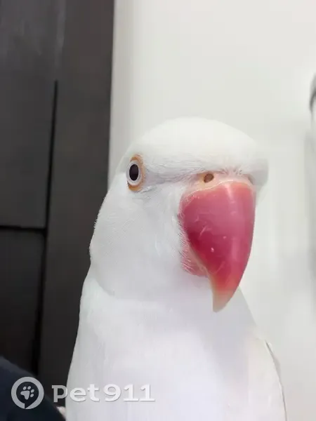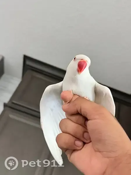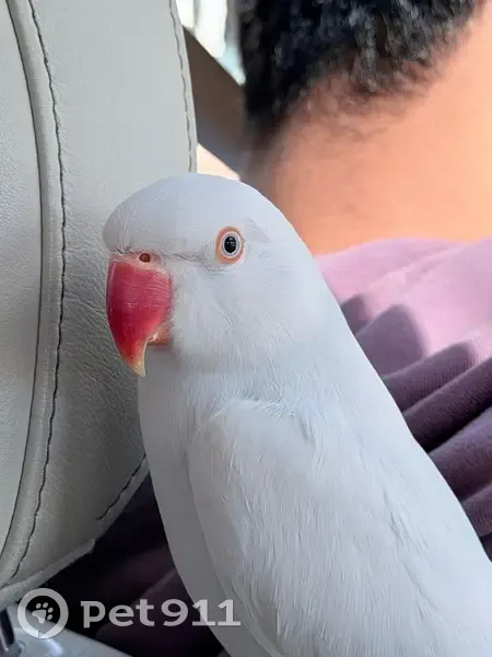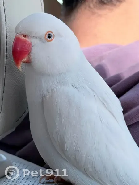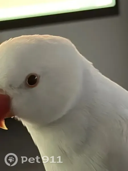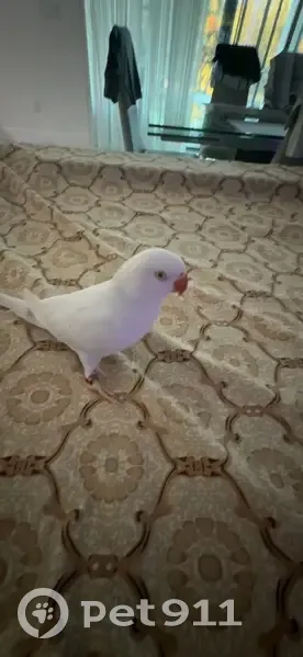 He has a distinctive orange Beak and Pure white feathers that you can see slight shades of light blue underneath. He is shy but might come for food placed in front of him from a distance and might respond to Peach or Zafar(Zah-fur).