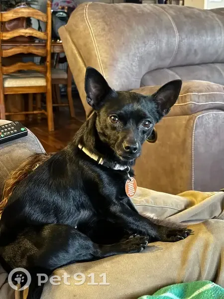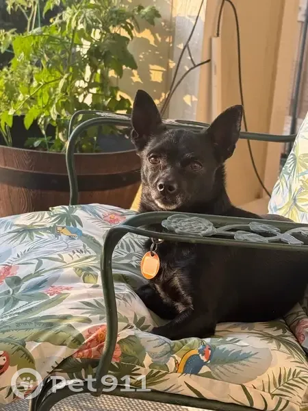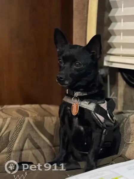 She is a small Chaweenie, about 7 lbs. All black with a little white on chin. She has a pink collar on with a tag with our vets phone number in Nevada. We recently moved here. She is very shy and will probably run when approached. She does like treats