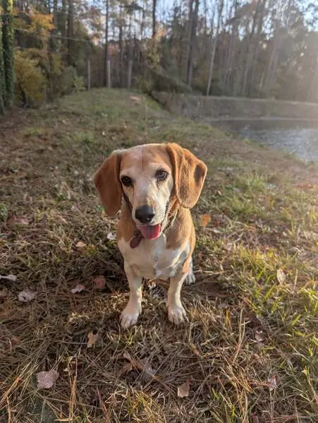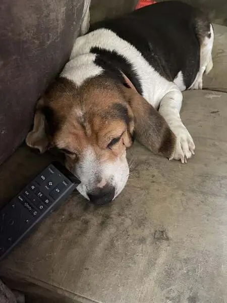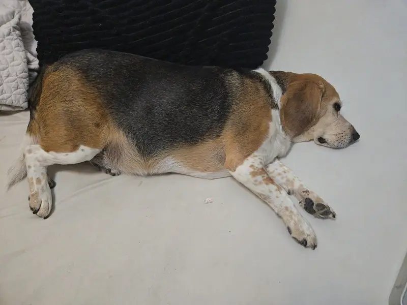 Tri colored male Beagle cherry eye in right eye well groomed and slightly overweight black back brown on legs and white chest. Stands about 15" and weight looks to be 25-30 lbs