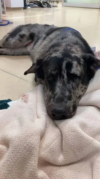 She is a 4 year old Australian cattle dog/heeler mix with a white and black coat, uneven spots over her body, and a black patch over her right eye. She is a skittish, energetic dog who is afraid of people and other dogs. She has been missing since late night 5/11 or early morning 5/12.
