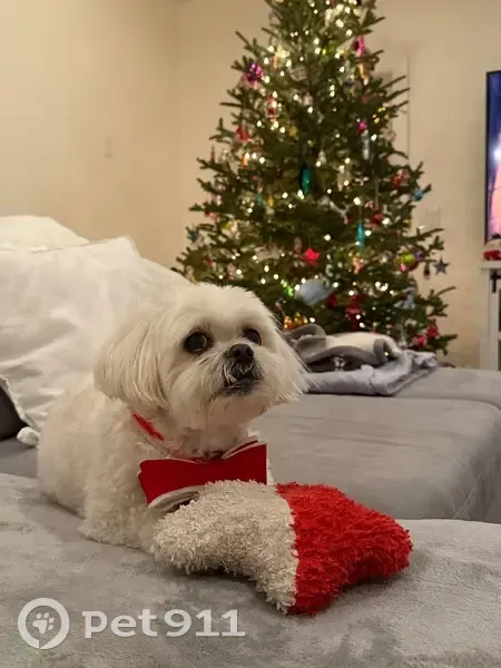 White Shitzu-Maltese mix. Short hair, fluffy tail and ears. Has one snaggle tooth on the bottom. He is wearing a light blue collar with his tags on them. He’s very skiddish/shy so he might run away when approached.