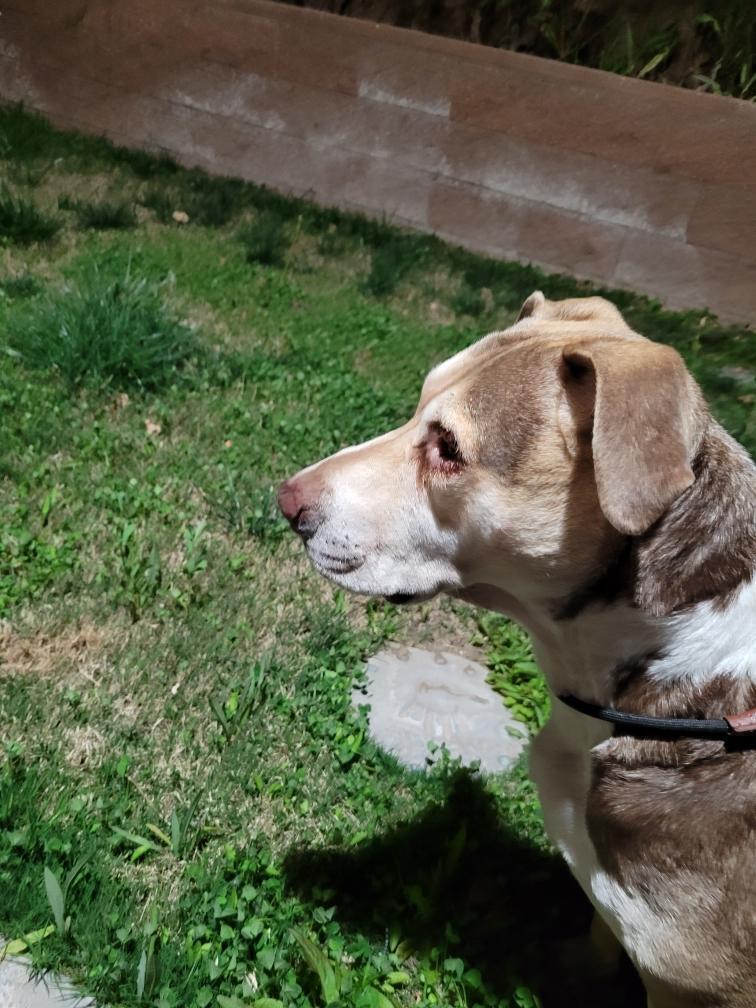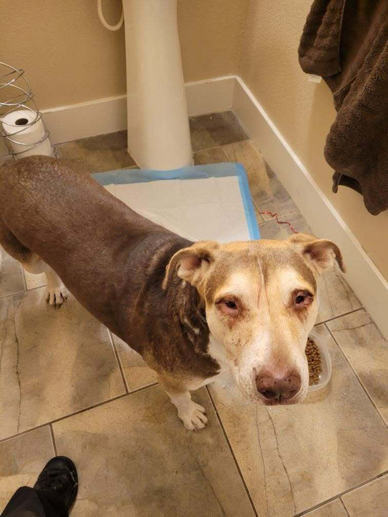 Very sweet girl. Brown and Tan pit bull that has gone white in the muzzle. She has a small mass like a fatty tumor on her left side. She has white feet, but is mostly a brown/tan color. Very sweet. Solidly built and sturdy. She's well behaved and very friendly. Does not have docked ears. Something was wrong with her eyes so we used a warm, wet paper towel to try and ease her discomfort. Taking her to vet to see if she's microchipped.