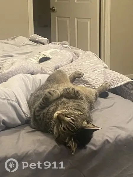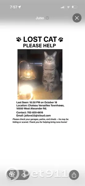 Juno was just released out of the hospital three nights before missing. He had a urinary blockage. I was told not to let him go out of his routine to cause less stress in him. He always sits outside of my balcony and hasn’t left except for this line of condos by me for the last three years. Everyone knows him. He has two front legs that are partially shaved from IVs. His groin area is also shaved. He is very loving very sweet, but also timid. And he is the love of my life. I need him home. He has a little hanging belly.
