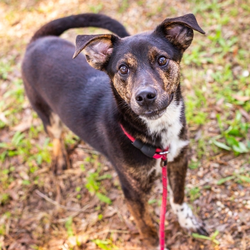 Black coat, Two white fromt paws with speckled darker spots, white chest and reddish brown markings on cheeks. Roughly 40-45 pounds, medium sized dog. He ran off after my grandmother opened the back door but we did not see where he went. Extremely friendly.