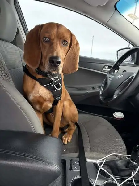 This beagle has a thin leather collar. He is intact and very sweet. He has one thin white stripe on his chest, otherwise he is completely tan and black.