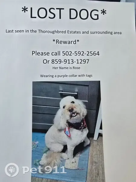REWARD $200 for her safe return. She is a arlpricot goldendoodle weight about 35lbs she is 4 years old and very solid if you pick her up. She has been spayed and is microchipped and has been reported missing to local animal hospitals, animal control l, and pet link if found call (502) 592-2554
