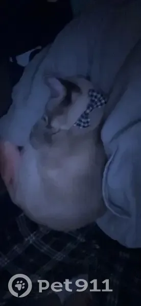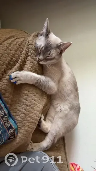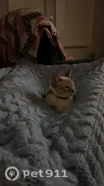 White with gray tail male cat. 9-10 pounds. Blue eyes with a black and white checkered bow tie collar. Colorful nail caps. He’s very anxious and probably will run away.