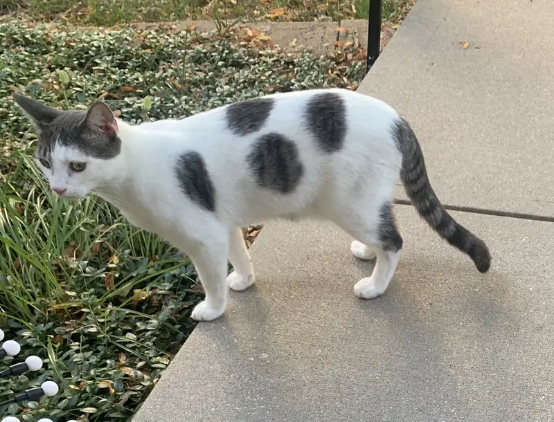 Red collar. He is an indoor cat and got out unknowingly around 9 am on 5/16. He is most likely hiding and skiddish of people. Black and white tuxedo cat.