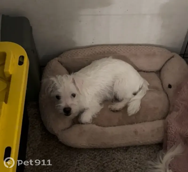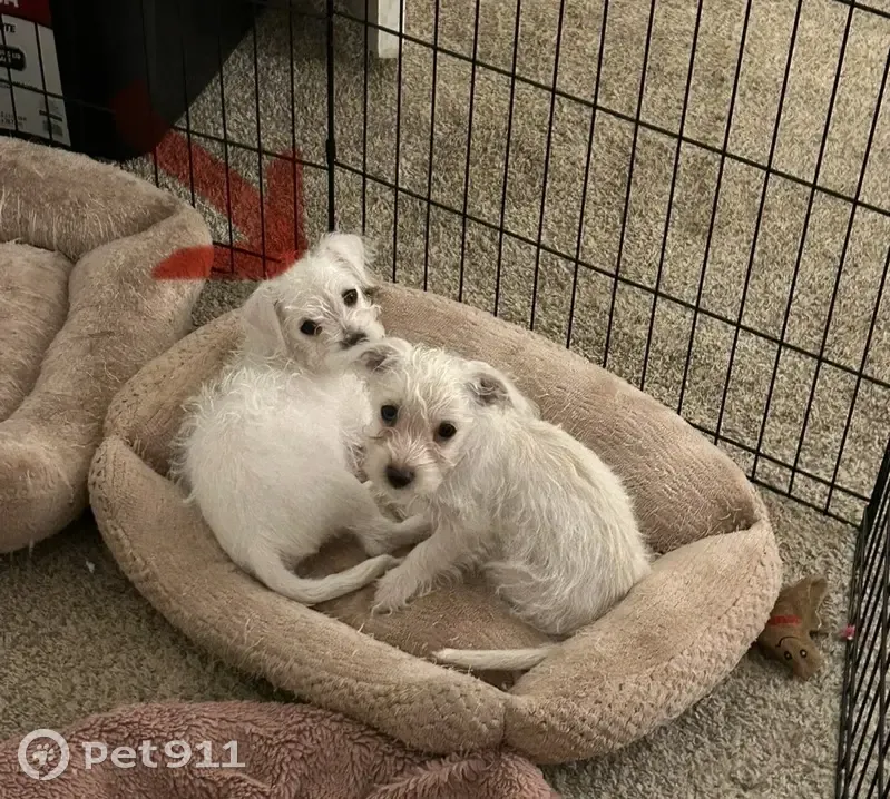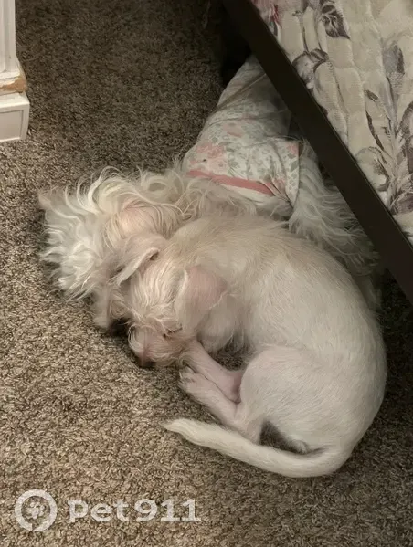 He just barely lost his collar. He has a long slender body but he has a West Highland Terrier “Westie,” look to him. He is white. His bottom teeth are crooked.