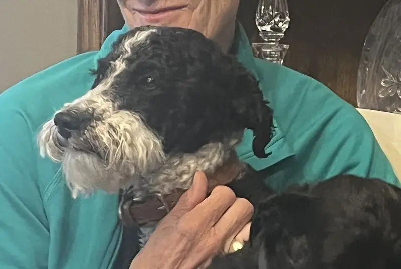 He is mostly white with black on his face hes a poodle so he is a bit tall and he has a black collar on and possibly part of the leash that he broke off as well