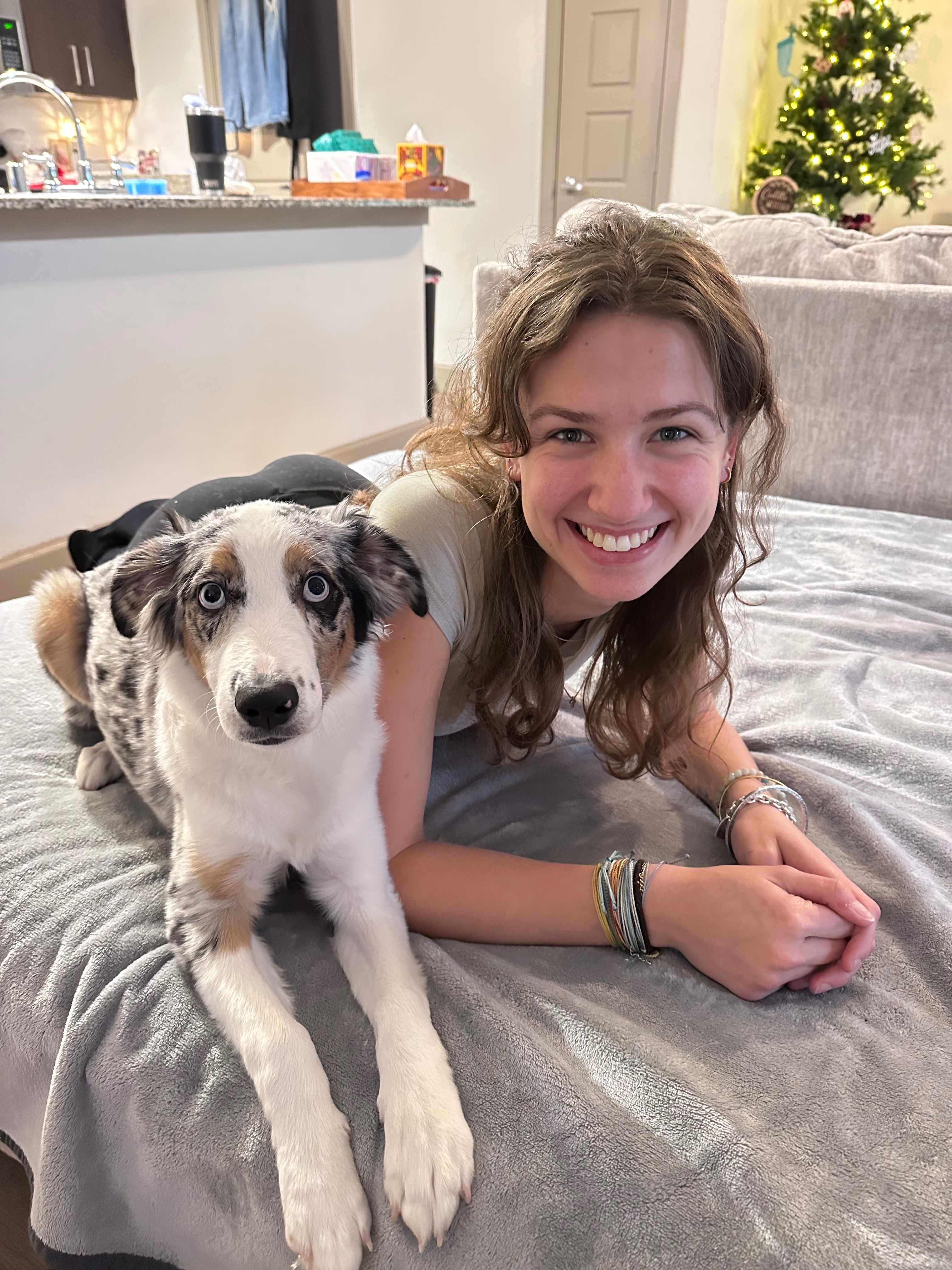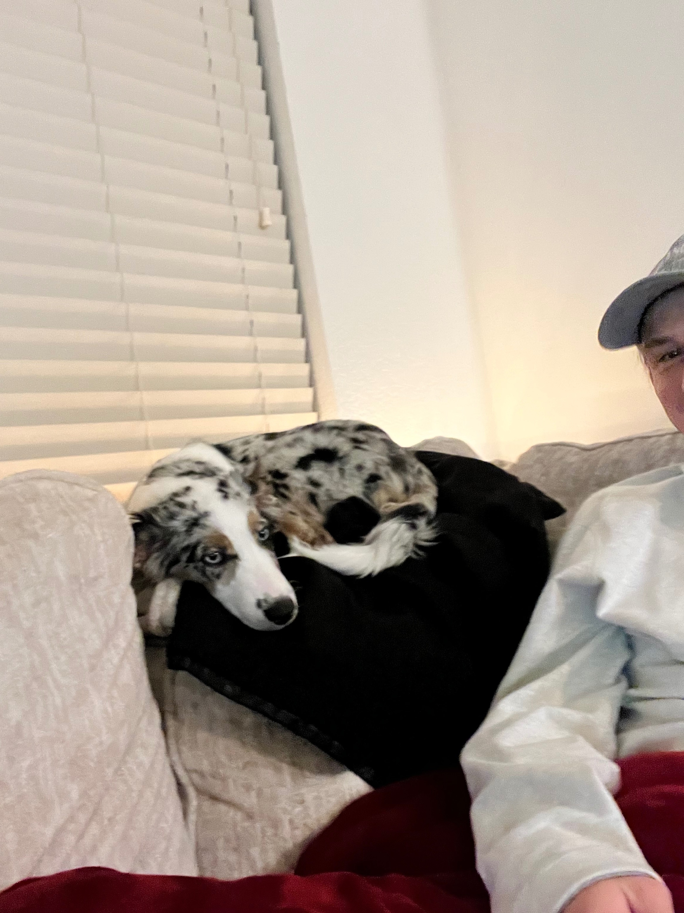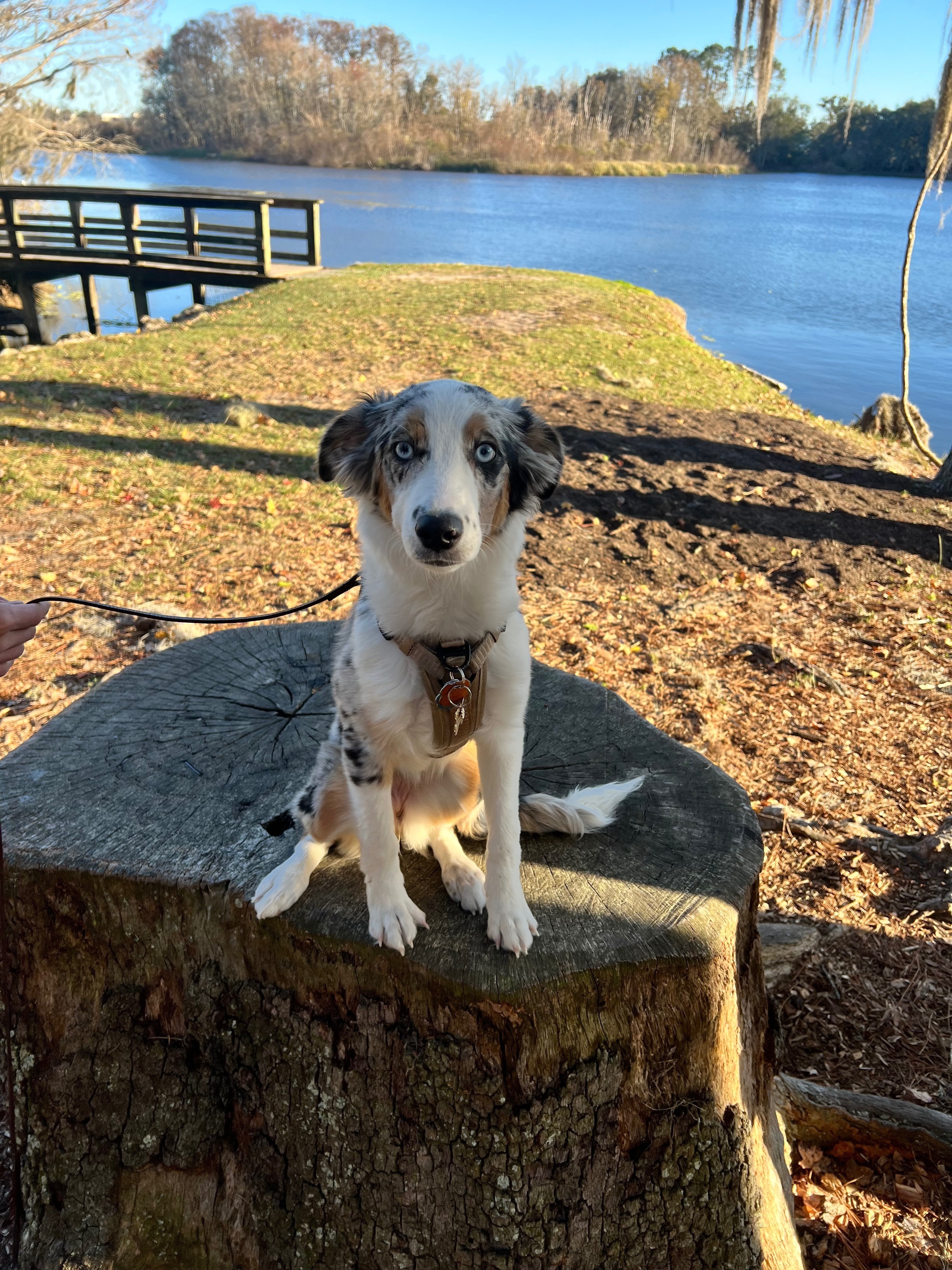 She is white with black and grey spots down her back and ears. She has bright blue eyes and brown fur around the eyes. She is very skittish and will run if approached. She bolted from the house when door got opened and didn’t stop running