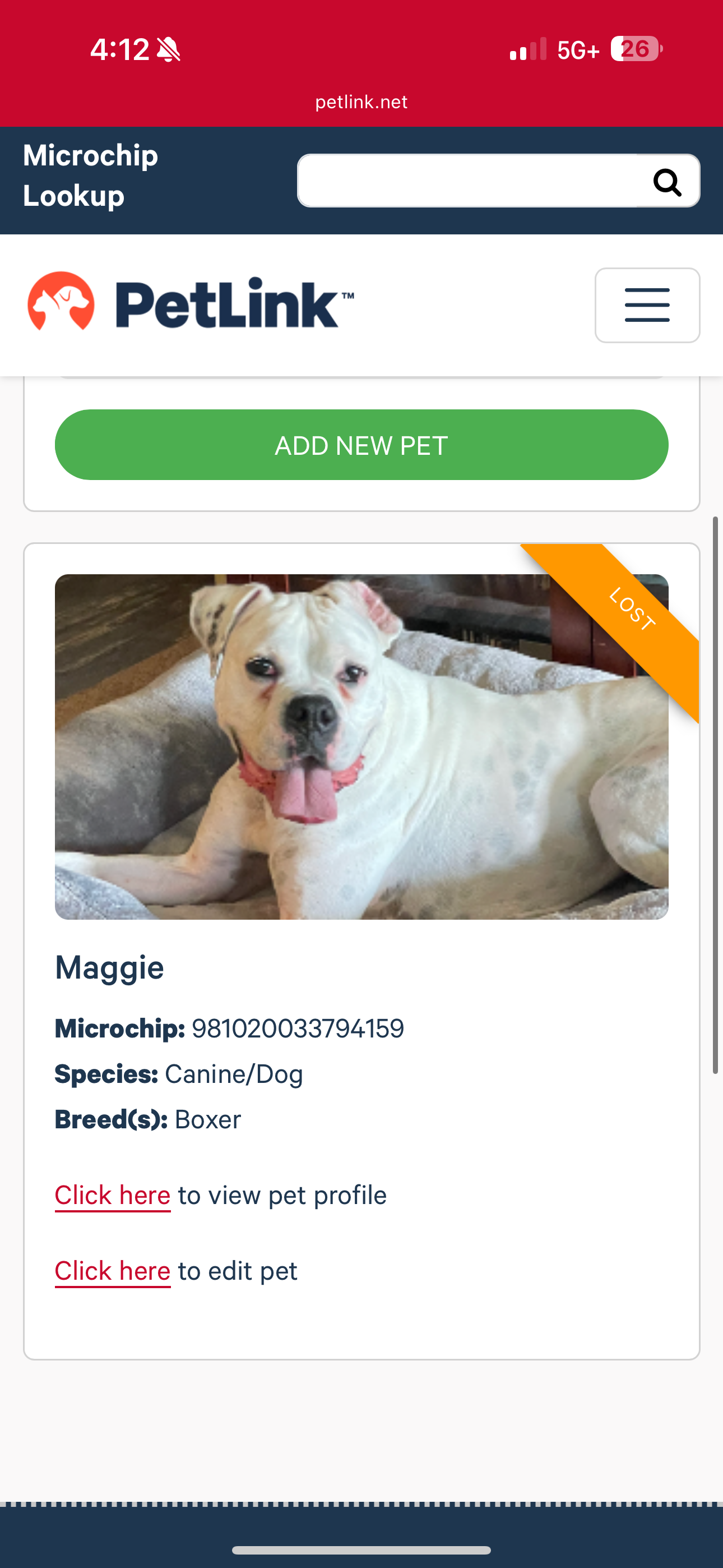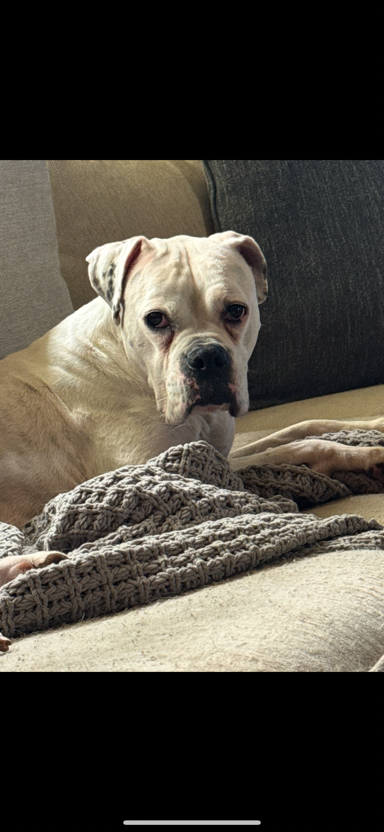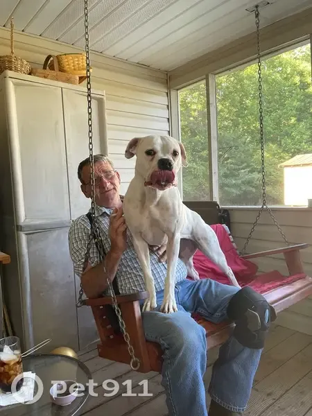 White with some light gray spots no collar has been chipped very gentle will not bite she went out to bathroom with other dog and they went into woods I went looking for them but could not find them Peter dog cam back about 45 minutes later she didn’t we spent all day and night calling and looking for her and this morning she hasn’t come Back